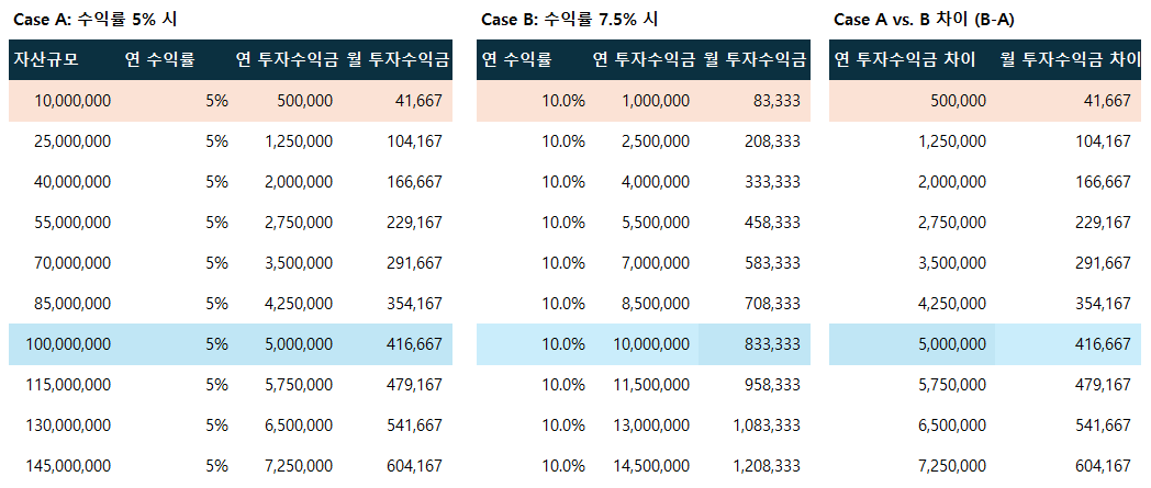 따라서, 1억원 이후부터는 돈을 불리는 방법은 아껴쓰는 것 뿐만이 아닌, 어떻게 자산 수익률을 더 높일것인가?에 초점을 맞춰야 할 것 같습니다. 자산 수익률이 5% → 10%로만 바뀌어도 연 1,000만원의 연봉이 오르는 것과 마찬가지니까요