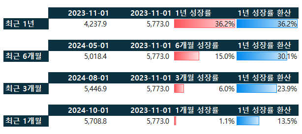 그래서 얼마나 구체적으로 성장세가 꺾인 것이냐?, 최근 12개월 1년치 성장성은 36.2%였구요, 최근 1개월 성장성을 12개월 1년치로 환산할 경우 약 13.5%, 약 1/3 정도 꺾인 것을 확인할 수 있습니다